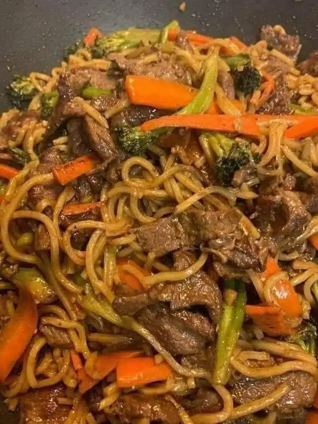Add the noodles and beef back to the pan and mix well from the bottom up for about a minute. Then cover the pan for a couple minutes.