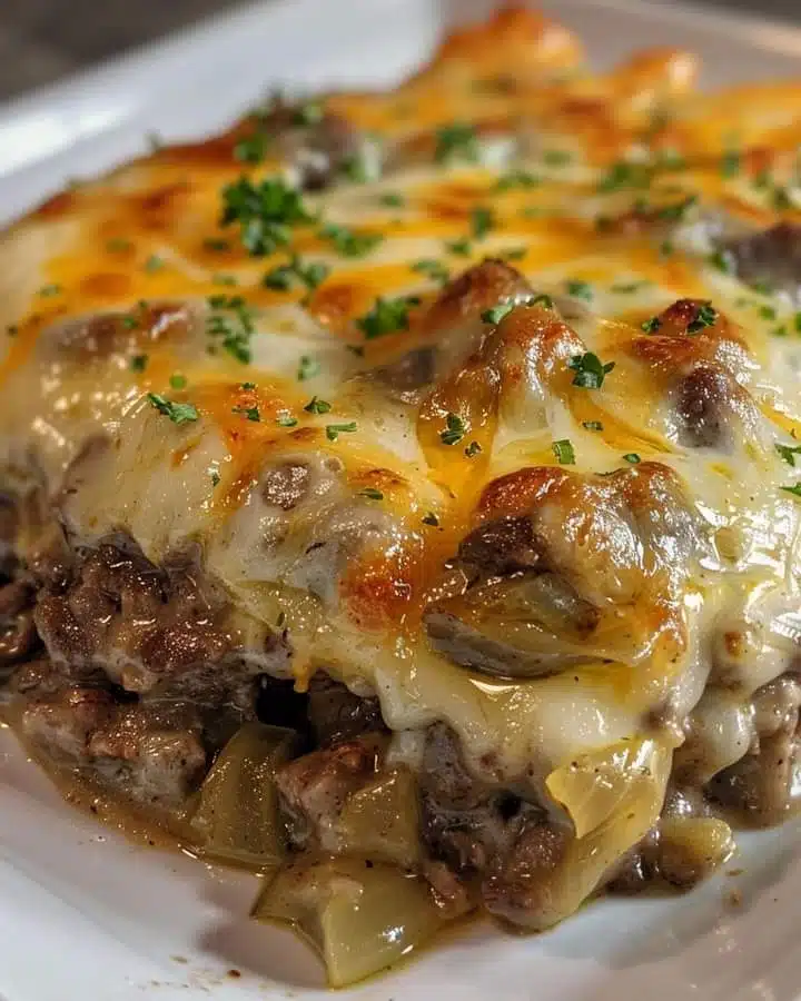 Transfer beef mixture to a baking dish. Sprinkle shredded provolone cheese on top.