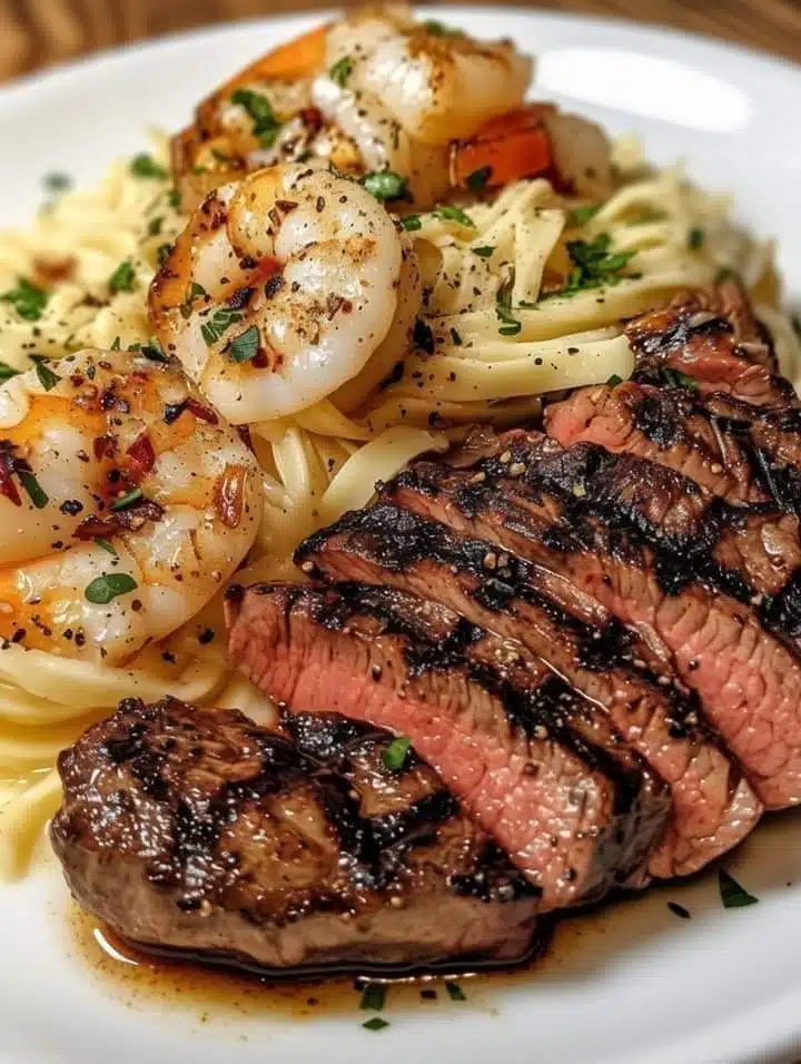 Slice the blackened steaks and add them along with the shrimp to the skillet with the lemon herb cream sauce. Toss in the cooked angel hair pasta until well-coated with the sauce. Garnish with lemon zest and fresh parsley before serving.