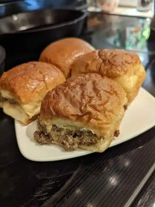 - Place bottoms of the buns in a baking dish, and top with beef mixture. Place pickles on top, followed by cheese slices, and top with top of buns.