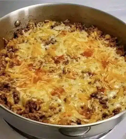 After stirring in the chopped tomatoes, rice, chili powder, cumin, and one and a half cups of water, season the dish to taste with salt and pepper.
