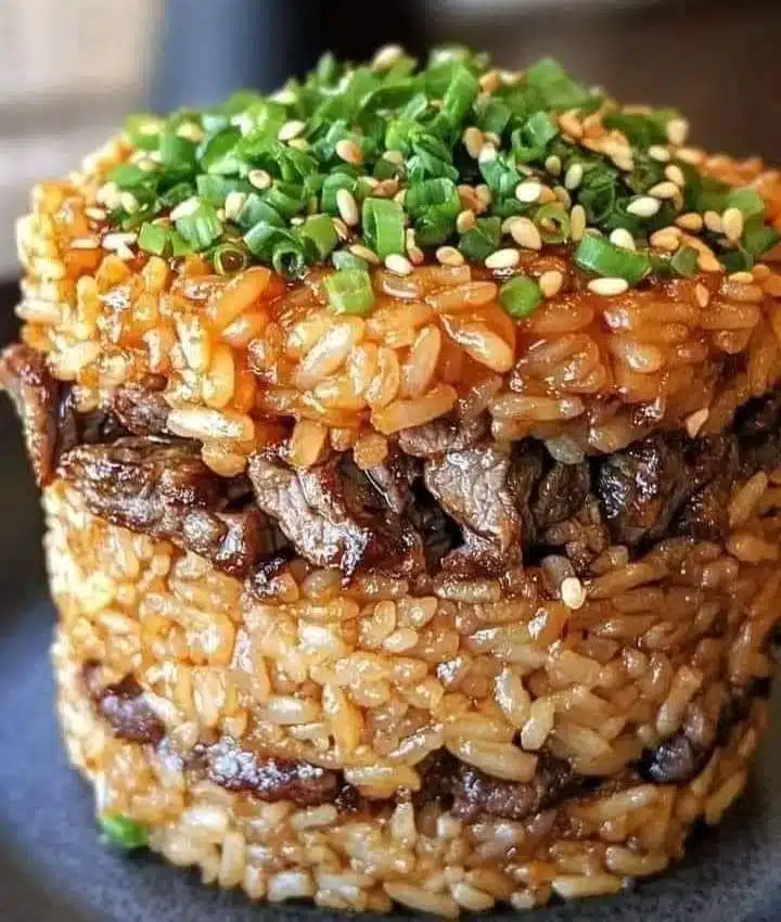Sesame Ginger Beef Rice Stack