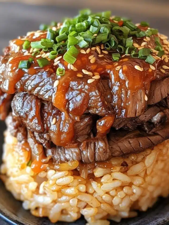 Sesame Ginger Beef Rice Stack