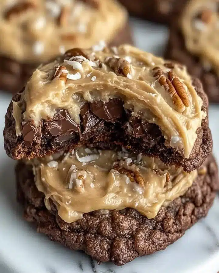 Once the cookies are completely cool, spread a generous amount of frosting on top of each cookie. Sprinkle with additional chopped pecans and shredded coconut.