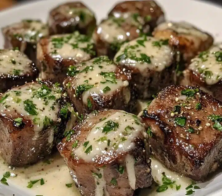 “Garlic Butter Steak Bites with Parmesan Cream Sauce