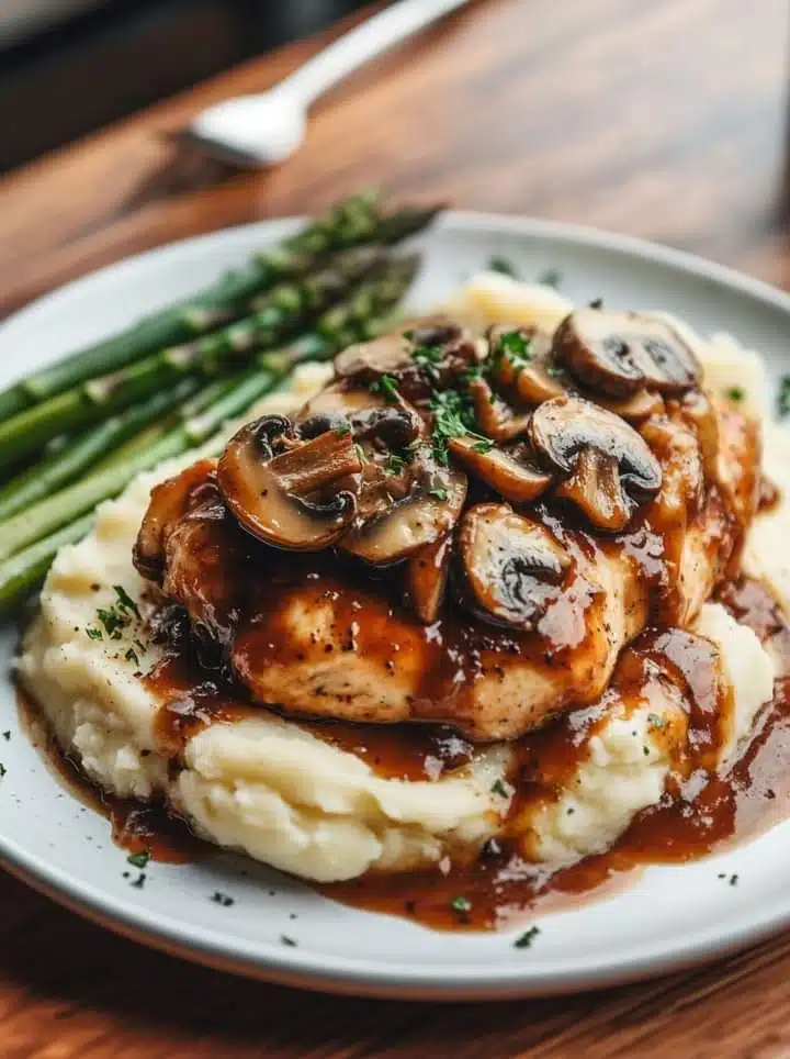 On a plate, create a bed of buttered mashed potatoes. Top with the chicken and mushroom sauce, allowing the cheese to melt over the chicken.