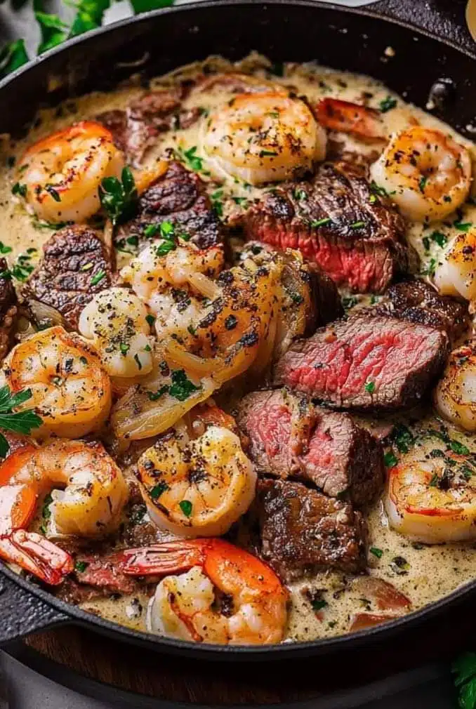 Steak and Seafood Skillet with Garlic Parmesan Cream Sauce