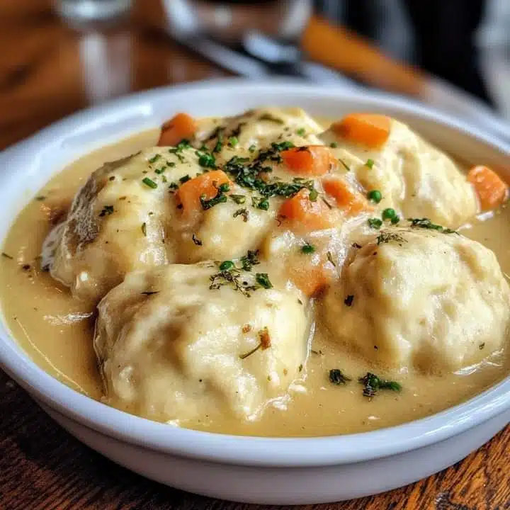 Cover the pot with a lid and let the dumplings steam in the broth for about 15 minutes, or until they are cooked through and fluffy.