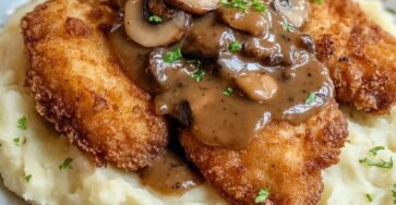 Smothered Fried Chicken with Mushroom Sauce and Mashed Potatoes