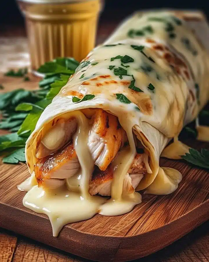 These wraps are bursting with flavor, featuring juicy shredded chicken, gooey melted cheese, and a rich garlic butter sauce all wrapped in a soft tortilla. Perfect for a quick, satisfying meal!