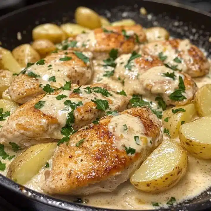 Enjoy your Chicken and Potatoes with Garlic Parmesan Cream Sauce—a creamy, savory delight for a cozy meal