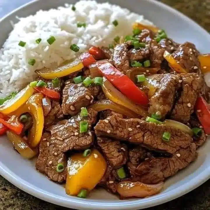 1 lb flank steak, thinly sliced against the grain 2 tablespoons soy sauce 1 tablespoon cornstarch 1 tablespoon vegetable oil 1 large onion, thinly sliced 2 bell peppers (any color), thinly sliced 3 cloves garlic, minced 1 tablespoon ginger, minced 1/4 cup soy sauce 1/4 cup beef broth 2 tablespoons oyster sauce 1 tablespoon hoisin sauce 1 teaspoon sugar 1/2 teaspoon black pepper 1/4 teaspoon red pepper flakes (optional) Cooked rice (for serving) Green onions, chopped (for garnish) Instructions: Marinate the Beef: In a medium bowl, combine the sliced flank steak with 2 tablespoons of soy sauce and 1 tablespoon of cornstarch. Mix everything well to coat the beef evenly. Let it marinate for about 15 minutes to soak in the flavors. Cook the Beef: Heat a large skillet or wok over medium-high heat and add the vegetable oil. Once hot, add the marinated beef and stir-fry until it is nicely browned and cooked through, about 4-5 minutes. Remove the beef from the skillet and set it aside. Stir-fry the Vegetables: In the same skillet, toss in the sliced onions and bell peppers. Stir-fry these for 3-4 minutes until they become tender but still slightly crisp. Add Aromatics: Add the minced garlic and ginger to the skillet with the vegetables. Stir-fry for another 1-2 minutes until they release their fragrant aroma. Prepare the Sauce: In a small bowl, whisk together 1/4 cup soy sauce, beef broth, oyster sauce, hoisin sauce, sugar, black pepper, and red pepper flakes (if you’re using them). Make sure the mixture is well combined. Combine and Cook: Return the cooked beef to the skillet and pour the prepared sauce over the beef and vegetables. Stir everything together and cook for another 2-3 minutes until the sauce thickens