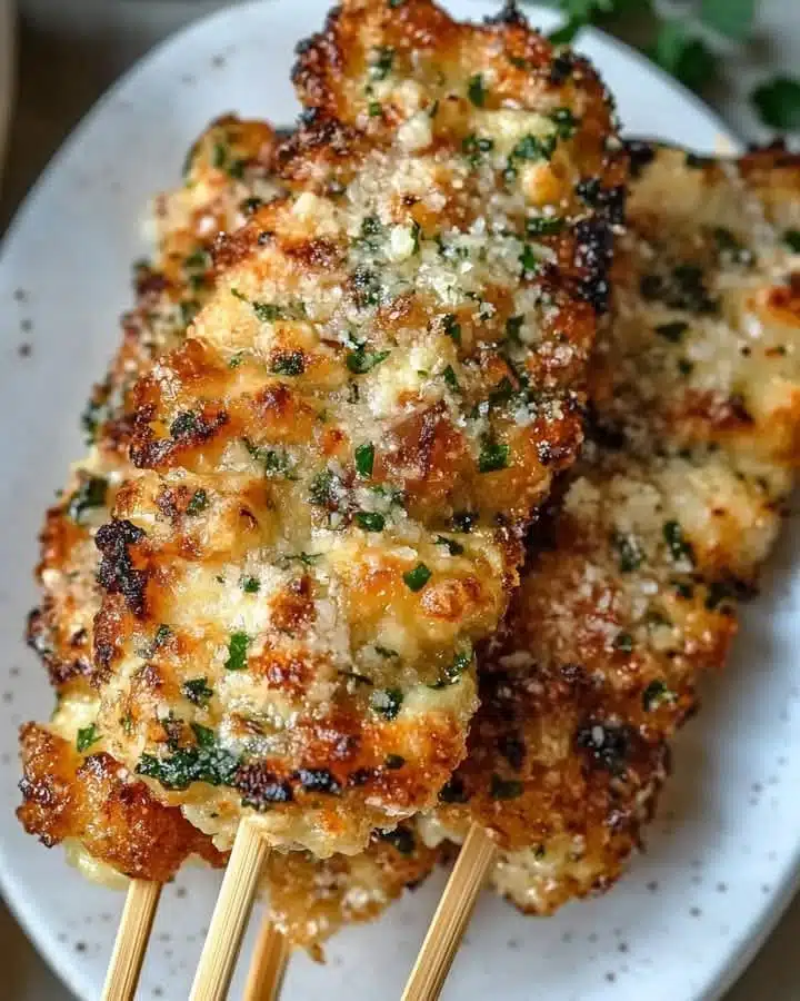 10. Finally, brush the skewers with the reserved sauce once more and sprinkle with extra parmesan before serving. Enjoy!