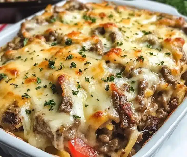 Bake the Philly Cheesesteak Casserole at 350 degrees f for 10-15 minutes or until the cheese melts.