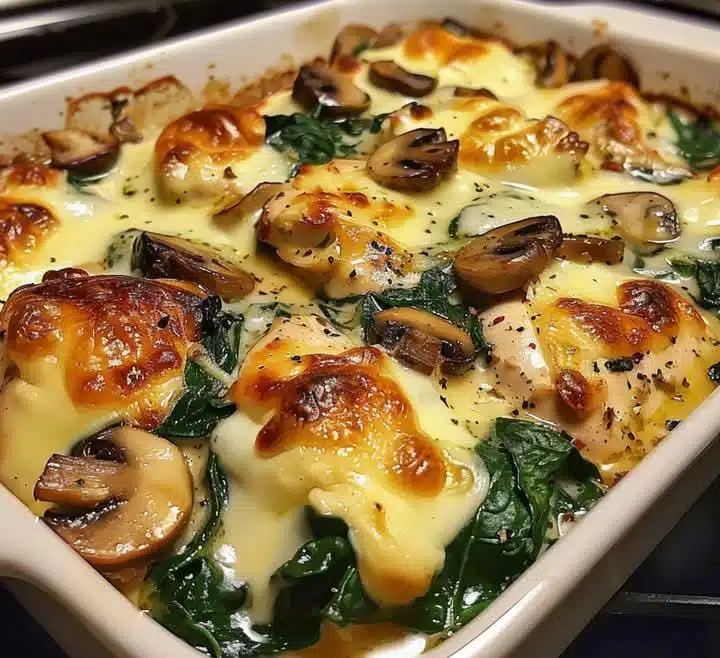 This hearty and flavorful dish combines tender chicken breasts with fresh spinach, mushrooms, and a creamy sauce, all baked to perfection.
