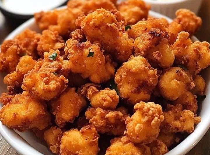 Fry 2 minutes – Pick up some chicken and put it in a spider with large holes and shake so excess flour falls through (or use hands to shake off excess flour then then transfer into a scoop to lower into oil). Carefully lower chicken into the oil. Fry for 2 – 2.5 minutes until golden, separating any that get stuck together around halfway through.