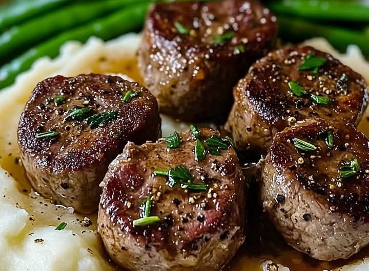 Garlic Butter Steak Bites with Mashed Potatoes and Green Beans