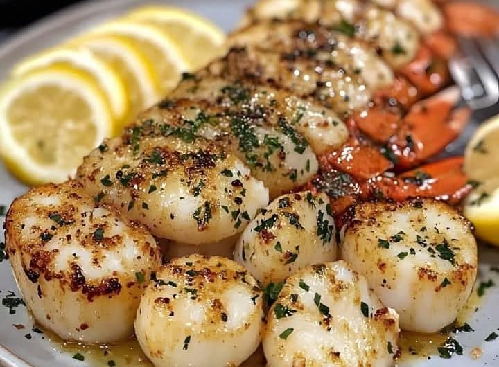Plate the Dish: Serve the garlic butter lobster tails and scallops together, garnished with fresh parsley and a drizzle of the garlic butter from the skillet. Pair with a side of lemon wedges for extra zest.
