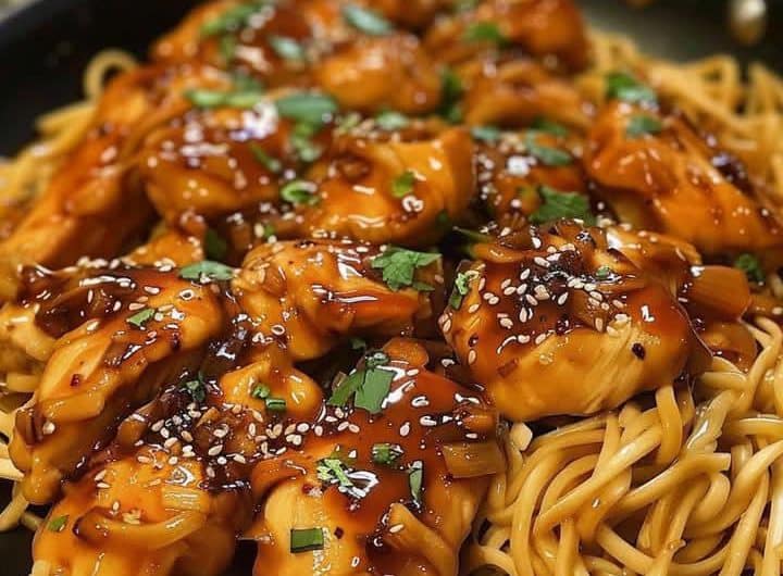This delightful dish combines tender chicken pieces with savory noodles, all enveloped in a sweet and garlicky sauce. It’s a comforting meal that’s both satisfying and easy to prepare.