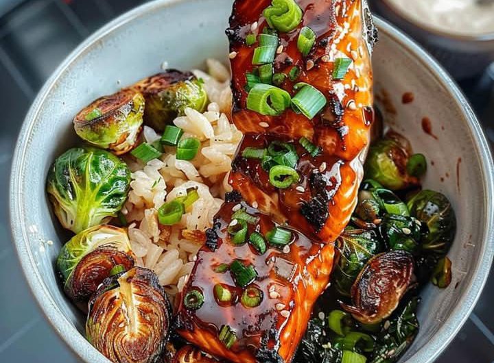This dish is pure magic—flaky, caramelized teriyaki salmon paired with crispy Brussels sprouts over a bed of rice. It’s sweet, savory, and full of bold flavors! A restaurant-quality meal right at home. Who else loves a good salmon bowl?