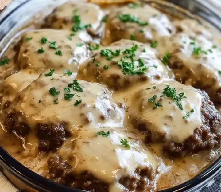 Add remaining layers: Top the patties with the remaining potatoes and onions. Pour the prepared gravy evenly over everything.