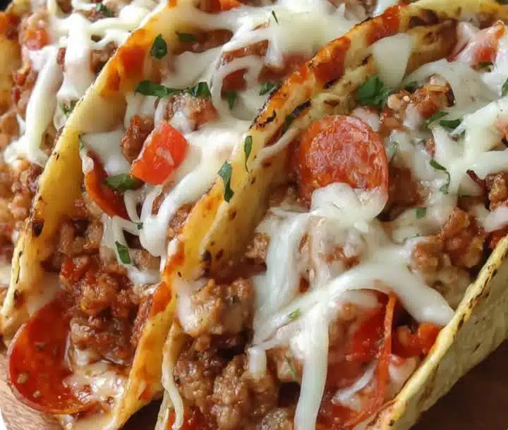 Imagine the best of both worlds—crispy taco shells filled with your favorite pizza toppings: ground beef, pepperoni, sausage, bacon, melty mozzarella, and tangy pizza sauce. This is not just dinner—it’s a flavor explosion that combines the richness of Italian pizza with the boldness of Mexican tacos!