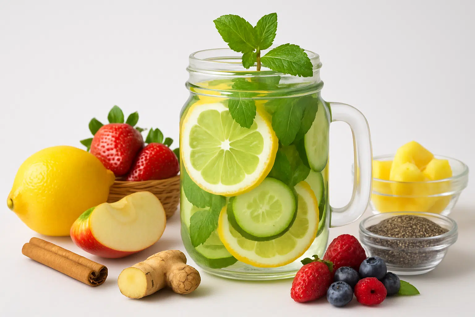 Detox water is water infused with natural ingredients like lemon, cucumber, mint, ginger, and fruits. These ingredients work together to support your body’s natural detoxification system — helping you sweat out toxins, improve digestion, and burn more calories.