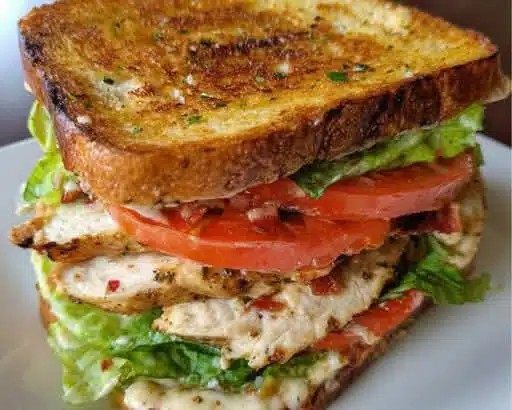 Garlic Butter Lettuce, Tomato & Grilled Chicken Sandwich — crispy, buttery toast meets juicy grilled chicken, fresh veggies, and creamy layers of flavor.