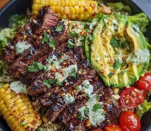 Perfect for meal prep, summer grilling, or a clean-but-comforting dinner, this bowl features tender grilled steak, sweet roasted corn, creamy avocado, and a tangy, herb-loaded cilantro cream sauce that ties it all together.