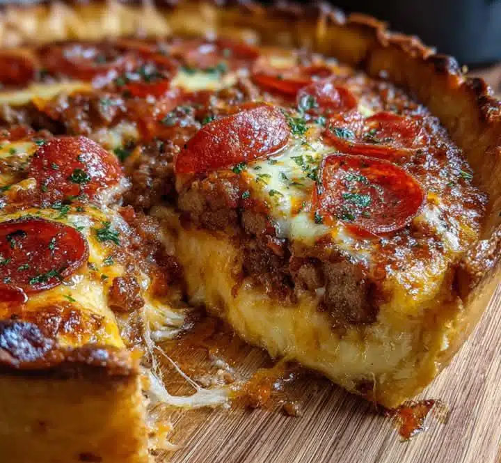 Love pizza night? Craving something heartier? This Deep Hamburger Sausage & Pepperoni Pie is a next-level mash-up between a meat-lover’s pizza and a savory pot pie. Loaded with ground beef, Italian sausage, melty mozzarella, and zesty pepperoni, all baked into a golden pie crust, this dish is cheesy, saucy, and completely over-the-top in the best way. It’s perfect for feeding a hungry family or impressing guests at game night or potlucks.