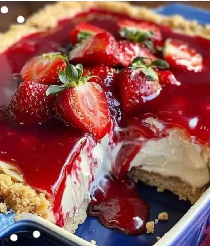 Let the dump cake cool for at least 15–20 minutes before serving—it will firm up slightly but still be soft and creamy inside. Top with fresh strawberries or a scoop of vanilla ice cream for the ultimate finish.