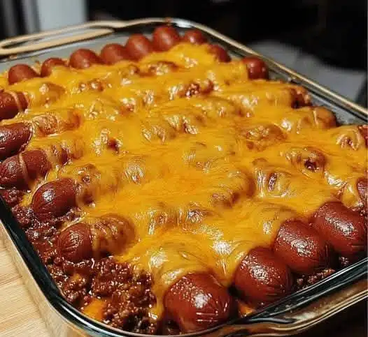 This recipe is the perfect combination of comfort food and visual appeal. The chili base is rich, savory, and slightly spicy, the hot dogs provide that nostalgic childhood flavor, and the melted cheddar cheese ties everything together into a gooey, indulgent masterpiece. It’s easy to prepare, feeds a crowd, and is guaranteed to be a hit at any table.