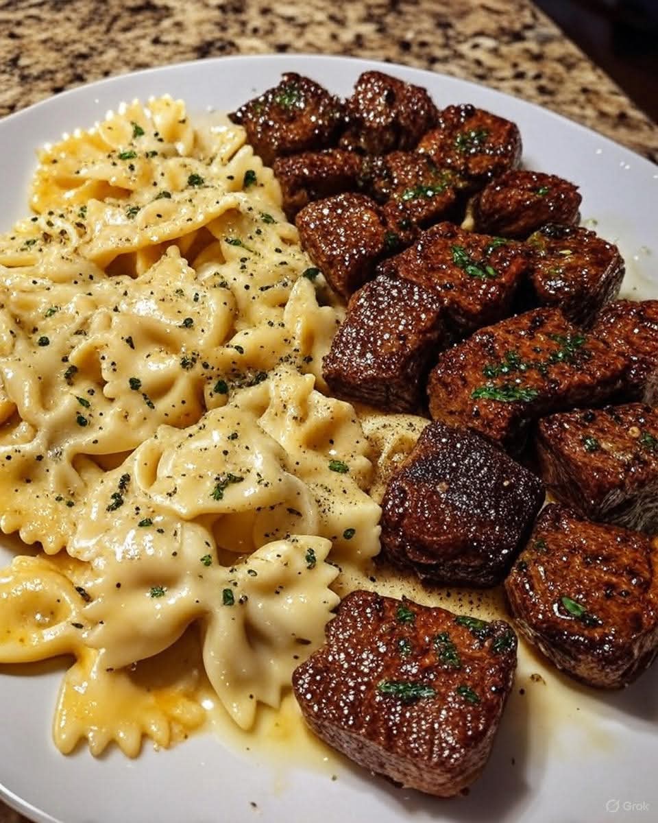 Garlic Butter Steak Bites & Creamy Alfredo Bowtie Pasta