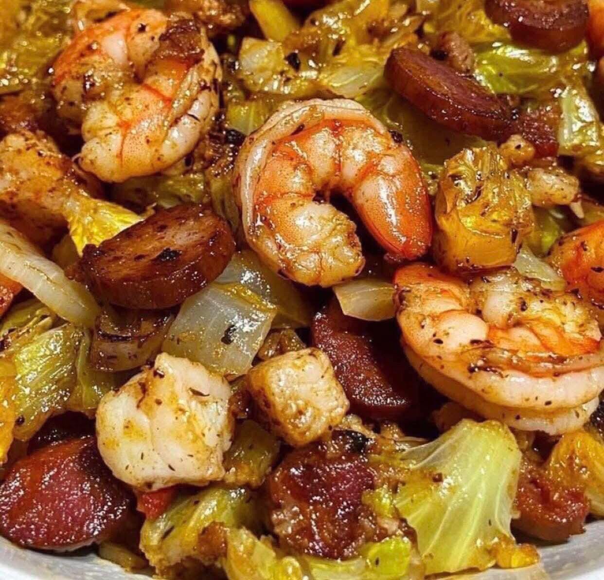 Fried Cabbage with Shrimp, Sausage & Bacon