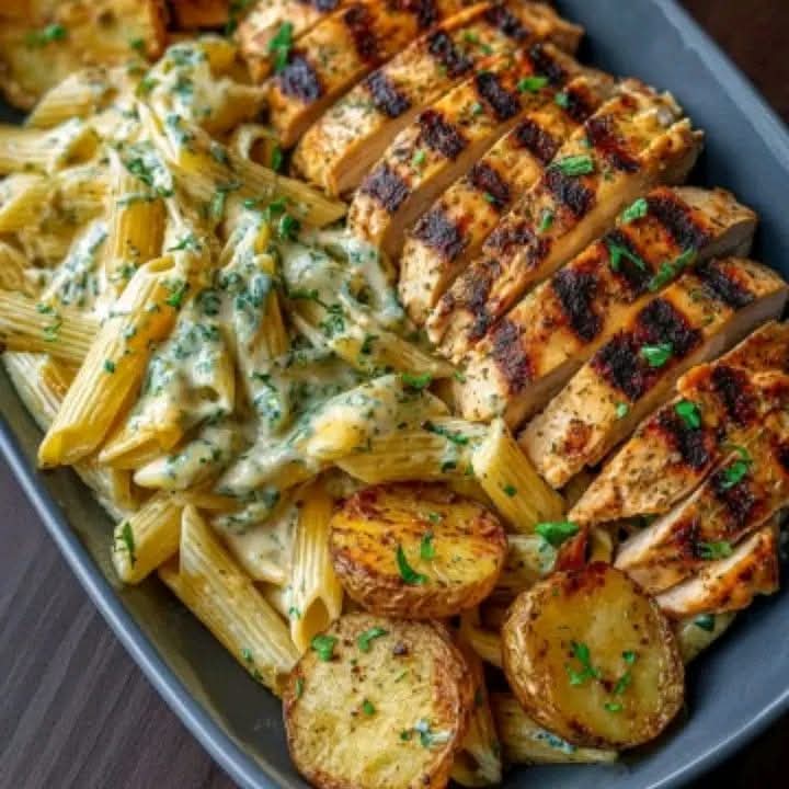Creamy Garlic Spinach Pasta with Grilled Chicken and Roasted Potatoes – A Dreamy One-Pan Comfort Meal!