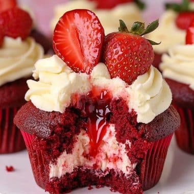 Red Velvet Crush Cupcakes with Strawberry Cheesecake Swirl
